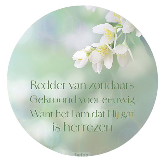 - Rond bord met de tekst: ‘Redder van zondaars, Gekroond voor eeuwig want het Lam dat Hij gaf is herrezen.’
