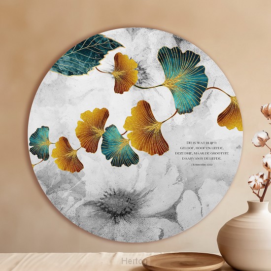 - Deze muurcirkel met goud- en groenkleurige bladeren tegen een grijze achtergrond en de Bijbeltekst uit 1 Korintiërs 13:13 straalt zowel rust als inspiratie uit. ...